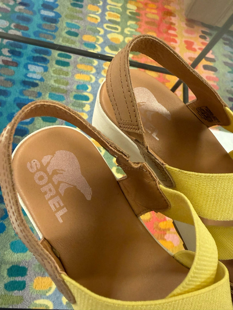 Like New, natural & yellow wedge sandal.